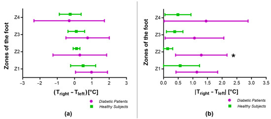 Figure 6. (a) Average by zone of the temperature difference of the right foot with respect to the left foot (subtraction of the temperature of the right and left feet), bars = SD. (b) Average by zone of the absolute difference in temperature of the right foot with respect to the left foot (absolute value of the subtraction of the temperature of the right and left feet), bars = SD, significant differences (*).
