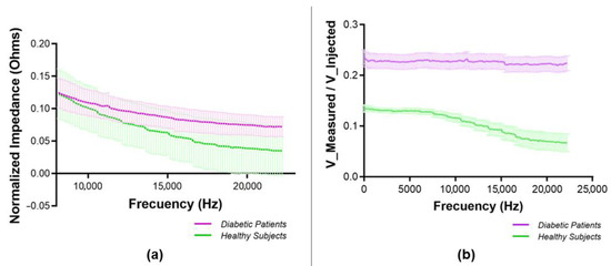 Figure 7. (a) Comparison of normalized impedance in diabetic patients and healthy subjects. Dotted lines indicate the standard error of the mean (SEM). (b) Comparison of the ratio of measured voltage over injected voltage in diabetic patients and healthy subjects. Behavior of the ratio of the measured voltage to the injected voltage in the two study groups: diabetic patients and healthy subjects. The dotted lines are the standard deviation (SD). SEM is not shown as it appears very close to the mean values.