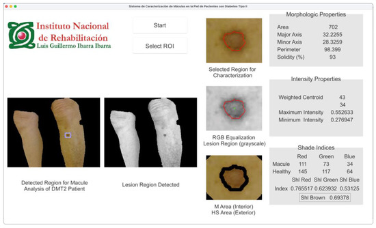 In this section, we present some of the results of the system for the detection and monitoring of macules in diabetic patients. With the processing of the images using the WAIS (Wireless Image System), the segmentation of the patients’ maculae into vascular, atrophic and traumatic was obtained, as well as the percentage of damage in the patient. A specialized software for skin macules called Skin Macules Characterization Software (SMaC©) was designed in MATLAB GUI; by analyzing the macules of this study (vascular, petechiae, atrophic and traumatic), it has been possible to identify the properties of each one of them, such as shade indices and morphological properties. It can be said that, with this system, it is possible to differentiate the types of macules since significant differences of p < 0.05 were found.