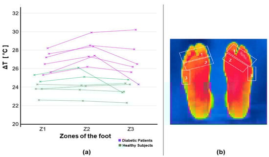 Figure 9. (a) Comparison of temperatures by zone of the sole of the foot; the purple line corresponds to the temperatures of diabetic feet and the green line to healthy subjects. (b) Areas selected for the temperature study.