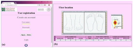 Figure 11. (a) Screen of the virtual platform to create a new account and log in; (b) screen for locating patients’ ulcers by recording their coordinates and their characteristics.