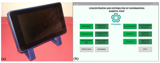 Figure 12. (a) Image of the portable diabetic foot information hub system; (b) screenshot of the interface for system control, acquisition of measurements, creation of the file, access to database, etc.