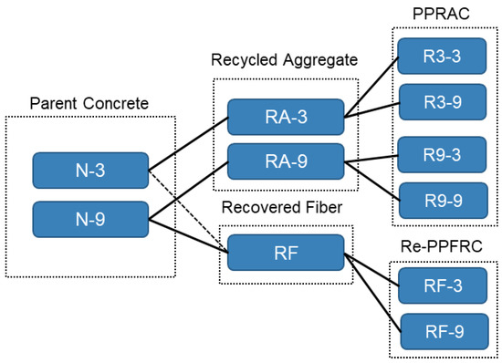 The obtained RA and RF were then used in the production of polypropylene fiber-reinforced recycled aggregate concrete (PPRAC) and recovered polypropylene fiber concrete (Re-PPRFC). For PPRAC, coarse RA was used (fractions 4/12 and 12/20 mm) from both parent concretes to produce PPRAC with 3 and 9 kg/m3 of virgin (i.e., new) PP fibers, according to the scheme in Figure 1.