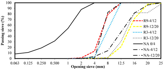 The mix designs of all the concrete mixtures are given in Table 2. As previously mentioned, the target for all the concretes was a mean compressive strength at 28 days of 30 MPa and a slump of 125 ± 25 mm. At the same water–cement ratio, RA concrete achieves, generally, a lower strength than NA concrete [2,3,4]. In order to achieve the same compressive strength, a common method used in the literature is to decrease the w/c ratio of the PPRAC [5]. Therefore, the PPRAC’s cement content was increased by 10% to 385 kg/m3. Additional water was simultaneously added to meet the water absorption rate: water for 50% of the 24 h water absorption was added to ensure the targeted workability was achieved. The plasticizer was adjusted for workability, with the necessary amount being influenced by the different aggregate content and shape.