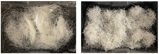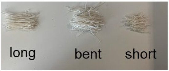 The recycled aggregate was sieved into 0/4, 4/12, 12/20, and >20 mm fractions. Aggregate fractions of 4/12 and 12/20 mm were retained to test the particle size distribution, absorption, and density [29]. The shape distribution of the collected RF as well as the recovery rate were characterized and analyzed. For the recovery rate, a 5 kg sample of crushed PPFRC was submerged in water, and the PP fibers were recovered by flotation. The weight of the fibers recovered from the 5 kg samples was expressed as g/kg and related to the theoretical fiber content in the parent concrete (3 or 9 kg/m3) through the density of the hardened concrete (i.e., 5 kg is approximately 0.002 m3). The RF was divided into three types according to their shape. A long RF was defined as one that is more than half the length of the original fiber, a short RF was one that is less than half of the original length, and the rest were classified as bent RF; Figure 6.