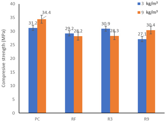 Figure 7 shows the compressive strength experimentally obtained for all the concretes. Within concretes made with the same aggregate, the influence of fibers is relatively minor. When considering a constant fiber content, the average compressive strength of the parent concrete is the highest, reaching 31.2 and 34.4 MPa for parent concretes with 3 and 9 kg/m3 of fibers, respectively. For the concretes with RF, the compressive strength is reduced to 6.4% and 18.0% for 3 and 9 kg/m3 of fibers, respectively. This finding can potentially be attributed to improper fiber distribution of RFs due to their shape, resulting in the balling of fibers and air pockets, which adversely affect the compressive strength of concrete [30,31]. Therefore, the recovered fiber has a negative effect on the compressive strength. For the RA, the compressive strength was also weaker than the NA (parent concrete), even though the cement content was increased. Nonetheless, it was shown that a target mean strength of 30 MPa can be achieved. The strength of the concrete with RA was not significantly affected by the RA type (R3 or R9).