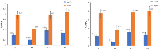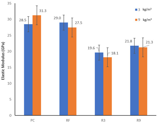 Figure 8 shows the elastic modulus of all the concretes. The parent concrete is similar to RF, increasing by 1.75% and decreasing by 12.1% at 3 and 9 kg/m3, respectively. However, for the RA, the modulus of elasticity underwent a significant loss when compared with PC, around 30% for both R3 and R9. Nonetheless, this is in line with findings in the literature on the effect of RA on the modulus of elasticity [30].