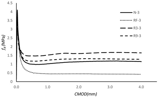 Figure 10 shows the fR,j-CMOD curves obtained from the three-point flexural test on notched prisms. Firstly, no significant differences can be observed between the concretes in terms of the flexural tensile strength at the peak load (i.e., fLOP), Table 5. This is in line with previous literature results, pointing to no significant effect of RA on the tensile strength of concrete [32].