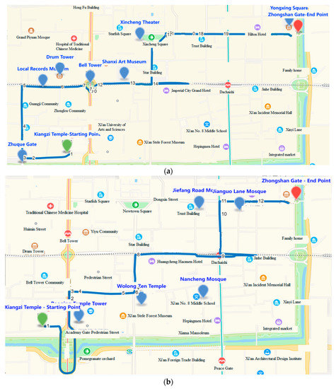 In Figure 14c, user u3 passes through the “Xi’an Academy of Arts and Sciences Campus”, “Pine Garden”, “Guayuan”, “Xi’an Stele Forest Museum”, “Museum of Mass Art”, and “Xi’an Incident Memorial Hall” along the way. The “Pine Garden” is rich in vegetation, clean in environment, and adjacent to the moat and ancient city wall. The “Pomegranate Garden” displays the cultural characteristics of the “Silk Road”. While exhibiting Xi’an’s culture, it has also become a “city complex” integrating culture, tourism, commerce, and life.