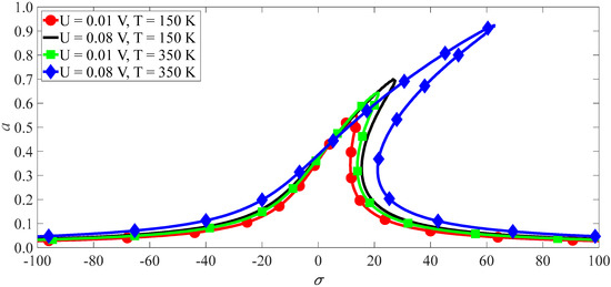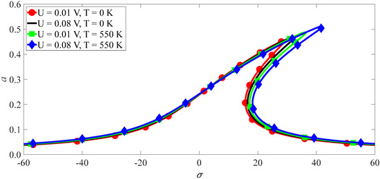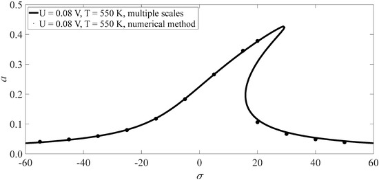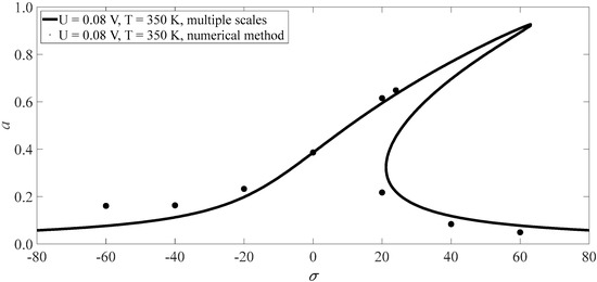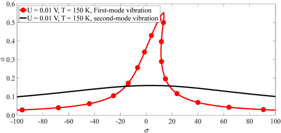 We can obtain the visible pattern of the relationship between the vibration amplitude and the parameters from Equation (21), as shown in Figure 3, Figure 4, Figure 5, Figure 6, Figure 7, Figure 8 and Figure 9. These Figures reveal the influence of the temperature field and the electric field on vibrations for the primary resonance. For the first mode (Figure 3), the initial value of the numerical solutions for the low branch is , and, at the high branch, it is . For the second mode (Figure 4), the initial value of the numerical solutions at the low branch is , and, at the high branch it is . From Figure 3 and Figure 4, it can be found that the multi-scale method is accurate. Figure 5 shows that the second mode is hardly excited when the first mode is excited. For example, when the load amplitude of the second mode is 20 times that of the first mode, the maximal vibrational amplitude of the second is only one-fifth of the first, as shown in Figure 5. It is found from Figure 6 that the maximum amplitudes with detuning parameters will increase when the temperature field and electric field increase, and the region being in multi values will also become larger. This rule agrees also with the second mode; however, the temperature field and electric field have a smaller effect than the first, as shown in Figure 7.