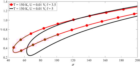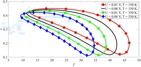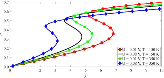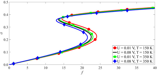 Through Equation (36)we can draw the vibration amplitude with the model frequency as a function of other parameters (as shown in Figure 10, Figure 11, Figure 12, Figure 13, Figure 14, Figure 15, Figure 16, Figure 17 and Figure 18). These figures reveal the relationship between subharmonic amplitude, temperature field, and electric field. These figures support the following main conclusions.