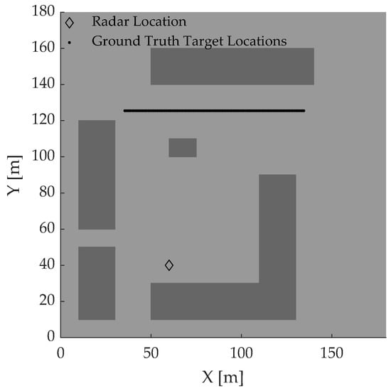 Simulations are presented to evaluate the proposed algorithm in this section. The scenario setup is illustrated in Figure 4, where the dark blocks represent the obstacles in the scenario. A radar locates at with the main lobe direction facing north. A total of 100 targets distributed from (35.5, 125.5) to (134.5, 125.5) along the x-axis direction at intervals of 1 m are simulated to study the robustness of the proposed localization algorithm in different multipath propagation conditions. The sampled locations computed offline are located at grids from (0, 0) to (160, 180) with intervals of 1 m along the x and y directions. Therefore, the off-grid error of localization caused by the distance between the targets and their nearest sample is m.