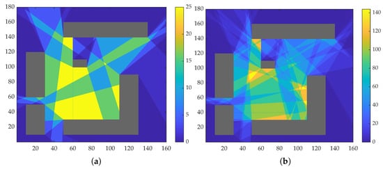 Figure 5 illustrates the number of round-trip multipath components in the study area restricted by a rectangle with length of 160 m and width of 180 m, where the times of bounces for a simulated single-trip path in Figure 5a,b is limited to less than one and two, respectively. The increase in reflection times complicates the multipath propagation model not only in the maximum received multipath components but also in the heterogeneity of multipath components. As is shown in Figure 5, the maximum number of round-trip paths is 25 for the single-bounce case, while the number increases to 144 for the double-bounce case. Moreover, the propagation model varies quickly and becomes more sensitive to target locations as the reflection times increase. However, the increased paths do not contribute to the localization area because they still cannot reach the shadow regions compared to the single-bounce case. Considering the requirement of radar signal receiving energy, the times of bounces are limited to less than one in the following simulations, and single-trip reflection paths of more than one bounce are considered undetectable.
