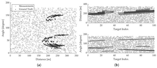 The ground truth of target multipath measurements as well as the cluttered measurements are illustrated in Figure 6. In the simulation, the probability of each path being detected is set to 0.8. Since the measurement of distance and angle are independent, zero-mean Gaussian noises are added to the distance and angle measurements separately with the corresponding standard deviation (STD) of the noises as and . Therefore, the covariance of measurement is given as