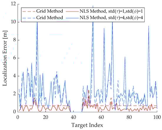 The localization results of the proposed algorithm are illustrated in Figure 7, where the dotted lines denote the grid-based localization error of the first step, and the solid lines denote the NLS-based localization error of the second step. Results from index 38 to 48 are excluded because no path of the target behind the obstacle propagates to the radar as shown in Figure 6b. Localization error is defined as the Euclidean distance between the estimated target location and the ground truth by . The red lines present the simulation results that the STD of distance and angle measurement equals one. In the case of low noise level, the grid-based method results are accurate, and the off-grid error is the main cause of localization error. Therefore, the NLS-based method can improve the localization accuracy based on the correct estimation of the multipath propagation model. However, in the case of high noise levels displayed in the blue lines, the NLS-based approach shows little improvement due to the incorrect multipath propagation model estimated in the first step.