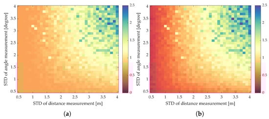 Figure 8 shows the RMSE with respect to different distance and angle noise STD, where Figure 8a is the grid-based result, and Figure 8b is the NLS-based result. The simulation result in Figure 8a shows that the first step of the proposed algorithm is more sensitive to distance measurement than angle measurement. Accurate localization results are obtained regardless of angle error in the condition that the STD of distance noise is less than one. However, the localization error increases along with the STD of distance when the STD of angle is less than one. The reason is that nearby samples share similar received angles, while the distance varies greatly. Therefore, if the distance measurement is precise, measurements with large angle errors are not associated with nearby samples. However, if the angle measurement is accurate and the distance measurement is inaccurate, the measurement is more likely to be associated with a nearby sample with similar angles and result in a wrong estimated location. Results illustrated in Figure 8b validate the effectiveness of the NLS-based re-localization process when the first step estimates the correct sample location.