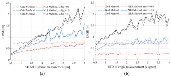 RMSE of localization versus STD of the measurement: (a) grid-based results; (b) NLS-based results.