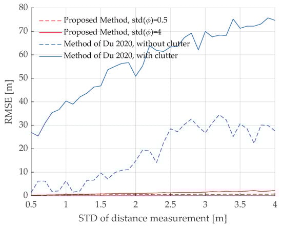 Existing multipath localization algorithms do not consider detections with clutter, and most of them have strict restrictions on the target scene, such as in the corner of a corridor [] or in an urban canyon []. We choose an NLOS target localization algorithm based on grid matching of TOA returns proposed in [] to verify the performance of the proposed algorithm. Since the original referenced algorithm does not consider measurements with clutter, the performance of the referenced algorithm is evaluated by Monte Carlo simulations with clean measurements as well as cluttered measurements. Since the referenced TOA-only algorithm does not use angle measurements, we restrict the proposed algorithm by fixed STD of angle measurements and analyze the performance of the two algorithms with varying STD of distance measurement. The Monte Carlo results illustrated in Figure 10 show that the proposed algorithm of our paper outperforms the referenced algorithm under both conditions even if the STD of angle measurement is set up to four. Table 1 shows the RMSE of the two localization algorithms. The proposed algorithm performs well in both scenes, and the RMSEs are less than 1 m. However, the performance of the referenced algorithm decreases significantly in the presence of cluttered measurement, and the algorithm is not applicable in dense clutter environments.