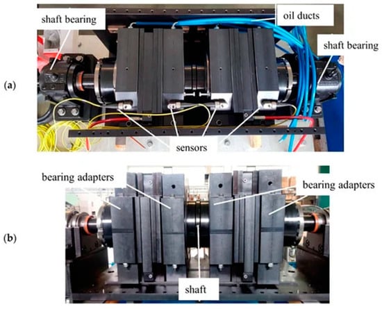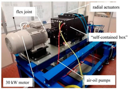 The test rig shown in Figure 1 is powered by a three-phase motor by SIEMENS®, which is connected to the SIEMENS® G120_CU240E_2 INVERTER with a brake resistor that drives the shaft up to 195 Nm of the maximum torque at the rated spin speed of rpm. The speed and torque controls, managed by the inverter, can set the motor speed up to rpm. The “self-contained box” (Figure 2) is made of two housing blocks with oil lubrication and is equipped with up to four different roller bearings, whose reactions are directly balanced by the box. Hydraulic actuators on the upper panel of the box and between each pair of bearings allow the application of radial and axial static loads, respectively, up to . The innovative design of the box makes it an isolated system with respect to all of the loads applied; in fact, radial and axial loads act only inside the box and are uncoupled with the outer part of the rotor system. The vibration signature is in the time and frequency domain as long as the operating temperature of each bearing under test can be measured through four SKF CMSS 2200 T sensors, which are mounted along the radial direction of the bearing-box adapters. Vibration signals are acquired through the LMS Scadas III Digital Acquisition system, equipped with four PQMAs (Programmable Quad Microphone Amplifiers). The main advantages of this test rig can be resumed as follows: