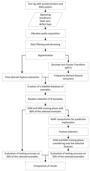 This paper is organised as follows: The introduction provides and overview of IFD and XAI by exploring the existing literature. Additionally, the aim of this work is described. The second section provides insight into the theoretical arguments underlying SVM, kNN, and Shapley values. The third section describes the test rig and the experimental activity conducted on medium-sized bearings. Section 4 includes the application of the SHAP analysis to the trained IFD models, whereas the fifth section provides the results and discussion on the explainability of diagnosis models and feature selection abilities. Finally, the sixth section includes the concluding remarks.