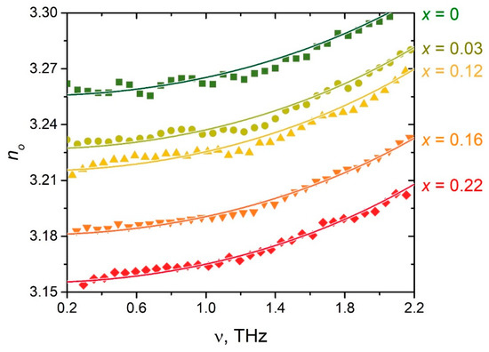 Dispersion of the terahertz refractive index for an ordinary wave of GaSe:S crystal samples. The x value is labeled for each curve. Symbols—experimental data, solid curves—approximation by Equation (1).