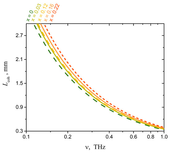 where nopt is the refractive index at the wavelength of λ = 1547 nm (experimental data from Figure 2); nTHz(ν) is the terahertz refractive index (experimental data from Figure 1); λ is the wavelength of laser radiation; νTHz is the frequency of a terahertz wave. It should be noted that in this case, we consider the simplest case of collinear propagation of laser and THz radiation along the c-axis. In our case, the value of dnopt/dλ is not strictly determined since we have not measured the dispersion of the refractive index in the vicinity of λ = 1547 nm for all crystal compositions. These data are also absent in the literature. Let us assume that with an increase in the sulfur concentration in the crystals, the value and dispersion of the refractive index change smoothly within the values corresponding to the extreme compositions of GaSe and GaS. The parameter dnopt/dλ at λ ≈ 1.5 μm is equal to −0.0418 μm−1 for GaSe and −0.0292 μm−1 for GaS [56]. Thus, in the general case, one should expect a deviation of no more than 10% in the denominator of expression (2) for some intermediate value of the sulfur concentration. Taking this into account, for subsequent calculations, we fixed dnopt/dλ = −0.04 μm−1. Figure 3 depicts the resulting dependences Lcoh(νTHz). It can be seen that with an increase in the sulfur content, the coherence length increases, which is due to a decrease in the difference between the optical and THz refractive indices. However, the changes in Lcoh(νTHz) are insignificant and fall within the uncertainty of our calculations due to the aforementioned assumptions.