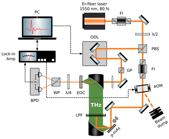 Detection is carried out by the free-space electro-optic sampling technique based on the Pockels effect [23,58,59]. The change in the polarization of the probe laser beam is measured using a detection system built on a quarter-wave plate, a Wollaston prism (WP), and balance photodetector (BPD). The signal from BPD is fed to a lock-in amplifier (SR844 from “Stanford Research Systems”, Sunnyvale, California, USA). It acquire the signal at the modulation frequencies of AOM and THz radiation, respectively. The PC controls the ODL and receives the digital signal from the lock-in amplifier.