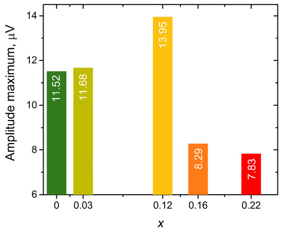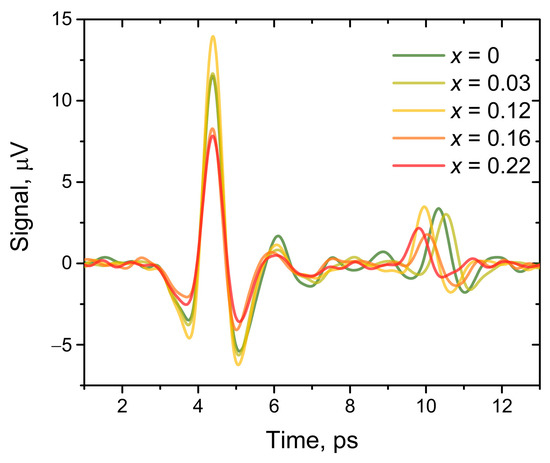 For clarity, Figure 6 shows the dependence of the peak value of the THz signal amplitude on x. The dependence is in good agreement with the work in which a similar study was carried out at the wavelengths of a titanium-sapphire laser [60]. Unfortunately, there were no samples provided with x in the range of 0.04 to 0.12; thus, we could not accurately determine the optimal sulfur content for maximum detection efficiency. According to [60], this value x should be in the vicinity of 0.11.