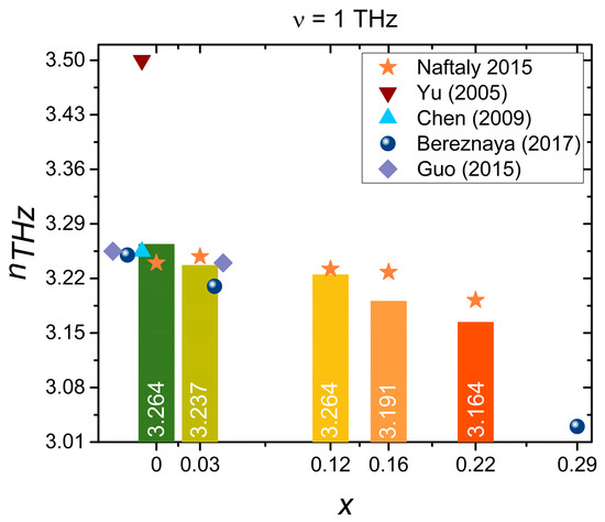 Ordinary refractive index of the GaSe:S crystals at a frequency of 1 THz. Data, measured in this work, are presented in bars and compared with the results published in other works: Guo (2015) [25], Bereznaya (2017) [38], Naftaly (2015) [53], Chen (2009) [54], Yu (2005) [63]. Some data for undoped GaSe is shifted horizontally for better readability.