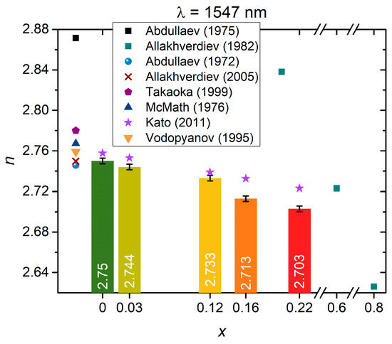 Ordinary refractive index of the GaSe:S crystals at λ = 1547 nm. Data, measured in this work, are presented in bars and compared with the results published in other works: Allakhverdiev (1982) [34], Allakhverdiev (2005) [39], Takaoka (1999) [40], Vodopyanov (1995) [41], Abdullaev (1975) [42], Kato (2011) [56], Abdullaev (1972) [64], McMath (1976) [65]. Some data for undoped GaSe is shifted horizontally for better readability.