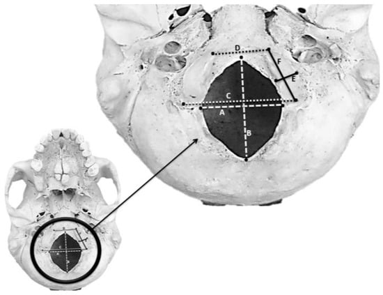 Anatomical landmarks of the foramen magnum and occipital condyles: (A) maximum transverse diameter of the foramen magnum, (B) maximum anteroposterior diameter of the foramen magnum, (C) posterior tip of occipital condylar width, (D) anterior tip of occipital condylar width, (E) maximum transverse length of occipital condyles and (F) maximum anteroposterior length of occipital condyles.