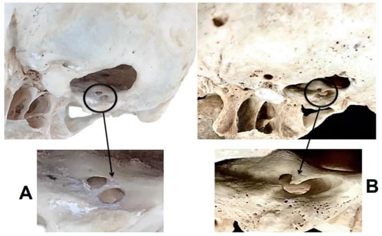 - Saheb, H.S.; Mavishetter, G.F.; Thomas, S.T.; Prasanna, L.C.; Muralidhar, P.A. Morphometric study of the jugular foramen in human adult skulls of South India. J. Biomed. Sci. Res. 2010, 2, 240–243. [Google Scholar]