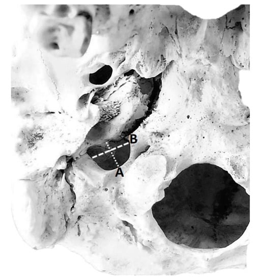 In addition, to locate the jugular foramen (Figure 3) precisely, two parameters were measured on the specific landmarks by a digital Vernier caliper as follows: