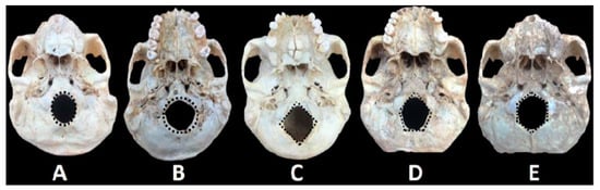 Anatomical variation of shape of the foramen magnum under the base of the skull: (A) oval shape, (B) round shape, (C) tetragonal shape, (D) pentagonal shape and (E) hexagonal shape.