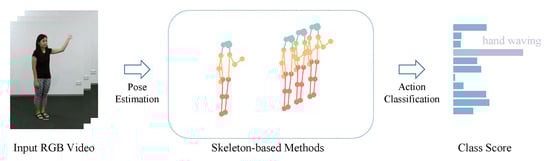Human action recognition refers to classifying and understanding what humans are doing in the input data. It has a wide range of applications in real life. For example, human action recognition can be used for home monitoring to monitor the behavioral activities of the elderly and to detect dangerous actions such as falls in a timely manner [], and it can help an automatic navigation system analyze and predict the action of pedestrians []. Commonly used inputs for human action recognition algorithms include RGB images and videos [], skeleton [], depth [], point-cloud [], and so on. Among these modalities, the RGB modality is the easiest to acquire and manipulate, using only the RGB cameras. However, action recognition algorithms based on RGB modality are often affected by appearance information, such as background, illumination, and color textures []. Besides RGB modality, skeleton modality is the most popular. As shown in Figure 1, skeleton modality refers to representing the human body through joint points and limb lines. Therefore, it is naturally concise but very precise in expressing motion information. However, in the actions of human–object interaction, the key appearance information cannot be captured, and the performance of skeleton-based human action recognition methods will be poor. By combining the skeleton modality with the RGB modality, the appearance information of the RGB modality can be utilized, and the precise dynamic information in the skeleton modality can also be utilized. Therefore, the methods based on both RGB and skeleton modalities are the best choice for action recognition tasks in practical applications.