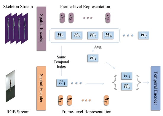 Since the great success of Transformer in natural language processing, a lot of works [,,,] have employed transformers for human action recognition. Inspired by ViT [], a pure Transformer architecture which has gained great attention in image classification, Bertasius et al. [] proposed a divided spatio-temporal attention mechanism to extract spatial and temporal features separately, dubbed TimeSformer. Each video is decomposed into a sequence of non-overlapping frame-level patches, then fed into each standard Transformer block with the proposed attention mechanism. Yan et al. [] proposed a multi-view transformer for video recognition (MTV). MTV feeds different views of input for different encoders and uses lateral connections to fuse cross-view information. Some works also attempted to apply Transformer in skeleton-based action recognition tasks. Zhang et al. [] designed Spatial Transformer Block and Directional Temporal Transformer Block for modeling skeleton sequences in spatial and temporal dimension, respectively. Plizzari et al. [] introduced a Spatial-Temporal Transformer network, where the spatial and temporal self-attention modules learn intra-frame joint interactions and inter-frame motion dynamics, respectively. The above Transformer-based methods are all based on a single modality. However, for human action recognition, only using the RGB data will be affected by noisy appearance factors, and only using the skeleton modality will lack appearance information when facing human–object interaction. Combining these two modalities means richer and more comprehensive information; the human behavior recognition algorithm based on both modalities will achieve a higher accuracy.