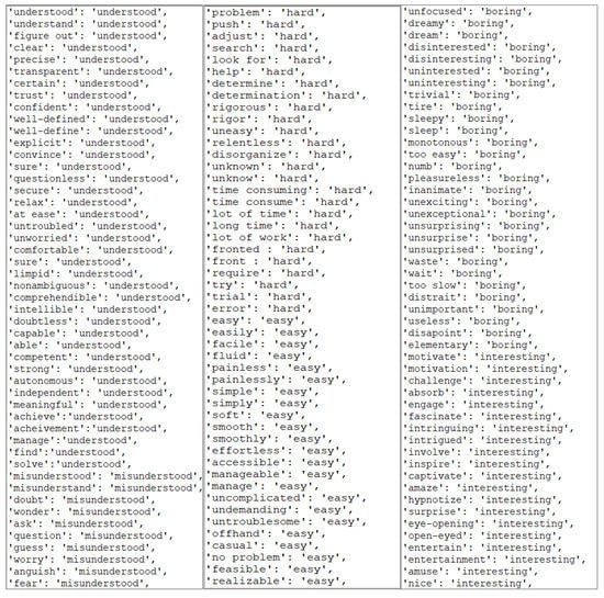 A dictionary of the word is needed for both of the libraries used. Like [22], we identified as many words (verbs, adjectives, and adverbs) as possible related to each emotional class. To reduce this hand-made work, we kept only the infinitive form of verbs. The result was a list of “word: class” pairs in a text file. Figure 3 shows a summary of the customized dictionary developed for this application. In most lexicon-based works [8,22], the dictionary is complemented by including synonyms and antonyms in the WordNet library. We tried to do it, but unfortunately, we observed that the synonyms we found were often not adapted to education’s vocabulary. As a result, when we began to remove the incorrect synonyms manually, it led to removing too many words. So, we concluded that this time-consuming work poorly improved the initial lexicon, and we decided to abandon this idea and keep only our hand-made dictionary. We also found the text2emotion’s codes interesting in handling negations. For example, we managed negation with a first function that was to delete any negation’s contraction, which means replacing any “n’t” with “not”.
