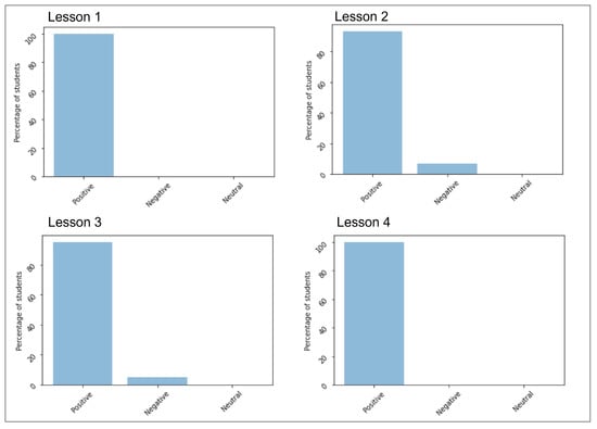 Figure 7 shows the percentage of the students’ feedback that is positive, negative, or neutral for the feedback files reviewed in our experiments. By looking at the results, which show the sentiment scores to the text collected from each lesson, we can conclude the overall sentiment of the students are positive, which means that their feedback includes a majority of positive words that conveys their positive emotions about the lessons.