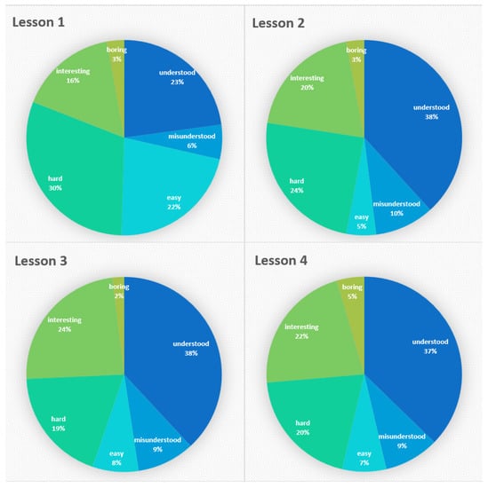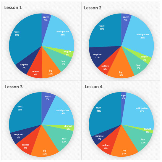 We applied the emotion analysis using an NLP tool that calculates the number of times anger, anticipation, disgust, fear, joy, sadness, surprise, and trust emotions are identified in the text. The pie charts shown in Figure 8 summarize the frequency of detecting each emotion in the students’ feedback of each lesson. We can conclude that the dominant feelings in all the lessons are trust and anticipation, which are positive feelings that reflect the students’ positive feedback about the lessons. Table 4 shows an overview of the number of students who expressed each specific emotion. We can conclude that most of the students experienced and showed the same emotions in their feedback.