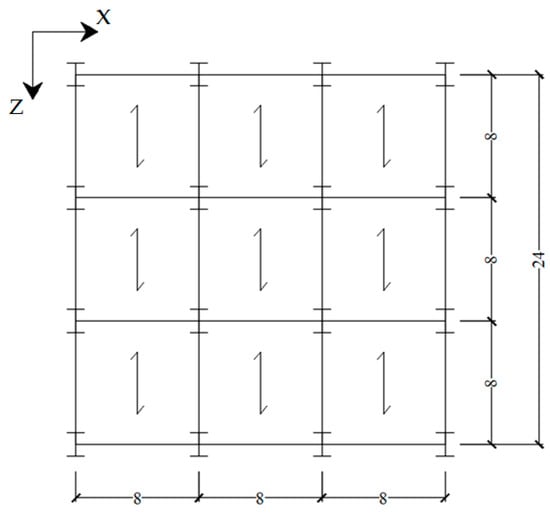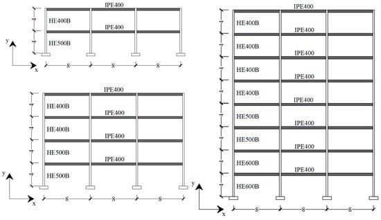 Three steel frame buildings, already used as case studies by other authors [,] and shown in Figure 1 and Figure 2, are considered to apply the proposed methodology. The buildings consist of two-, four- and eight-story frames with a square plan (24.0 × 24.0 m2), and three bays of 8.0 m each in the longitudinal and in the transversal main horizontal directions. The columns are continuous in elevation with an inter-story height of 4.0 m and oriented as shown in Figure 1. The beam sections correspond to IPE400 for each structure, while the column sections are HE400B, HE500B or HE600B according to Figure 2. The buildings, which have substantially different capacity along their two main horizontal directions due to the orientation of the cross-sections of the columns, are assumed as representative of old-code MRFs, designed without consideration of the requirement of similar resistance and stiffness characteristics in both main directions introduced in the current regulations []. Moreover, they envelope a wide range of fundamental periods of interest for conventional buildings [].