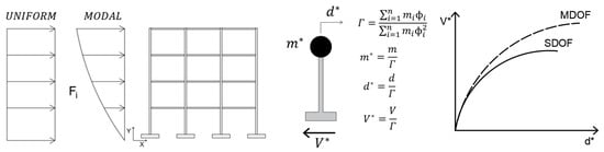 The capacity curve of the as-built structure () was determined via NLSAs as recommended in IBC []. The NLSAs were performed in the positive and in the negative X- and Z- directions of the structure (Figure 1), by applying two horizontal force distributions proportional to either mass (UNIFORM distribution) or modal (MODAL distribution) properties (Figure 3), and considering 5% accidental eccentricity of the center of mass of each story. The capacity curve of the MDOF structure was then converted to the capacity curve of the equivalent SDOF system through the modal participation factor , as shown in Figure 3.