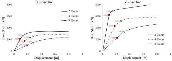 In each of the two main horizontal directions, the lowest capacity curve was used to evaluate the properties of the equivalent SDOF system. As shown in Figure 4, for each MRF, there is a substantial difference between the capacity curves in X- and Z-directions, due to the preferred orientation of the cross-sections of the columns, which have their strong direction aligned to the Z-axis.