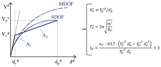 The equivalent bilinear curve of the SDOF main frame was evaluated consistently with IBC [] and clause C.7.3.4.2 of the Commentary [] by respecting three conditions: (i) having the same initial stiffness as the continuous SDOF capacity curve, (ii) passing through the performance point of coordinates (, and (iii) providing equivalence of areas A1 and A2 as shown in Figure 5. The equivalent SDOF system was characterized by an effective secant stiffness , an effective period and an equivalent viscous damping ratio (in percent) defined again in Figure 5. The first term in the expression of represents the contribution of the inelastic deformation of the frame to the total equivalent damping ratio, while the second term is the 3% inherent viscous damping assumed for steel structures [,]. The parameter was introduced to account for the energy dissipation capacity of the steel frame; it can be taken as for high damping capability, for moderate damping capability, and for low damping capability []; in this study, is assumed equal to .
