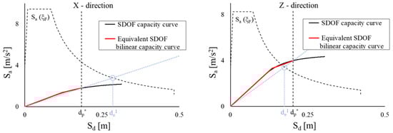 Comparison of the equivalent SDOF bilinear capacity curves of the four-story frame with the relevant demand response spectra in X- and Z-directions.