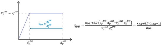In this work, hysteretic dampers with an elastic-perfectly plastic behavior similar to those assumed in other studies [,,,,,] were considered. Figure 7 shows the force-displacement curve of the equivalent SDOF damped brace, modeled as an in-parallel system of an elastic steel brace (B) and an equivalent SDOF hysteretic damper (D). The equivalent damping of the system was calculated according to the formula reported in Figure 7, where is a parameter that accounts for the energy dissipation capacity of the damper and is calibrated on experimental tests [,].