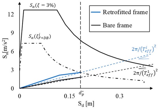 Once was determined from Equation (1), the equivalent bilinear curve of the equivalent SDOF retrofitted frame (F + DB) was constructed and plotted in the ADRS space, Figure 8. The ultimate displacement of the capacity curve of the braced frame is equal again to the target displacement , while the corresponding force at second iteration becomes .