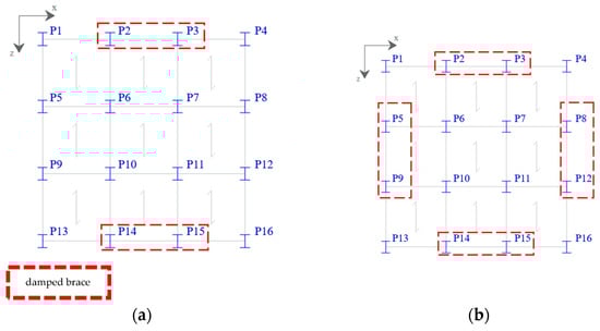 Plan layout of damped braces in (a) two-story and four-story structures, (b) eight-story structure.