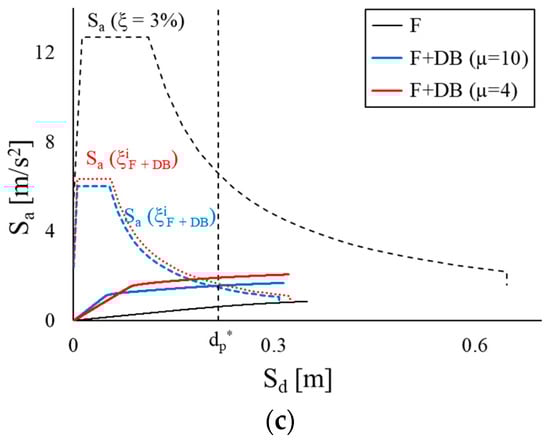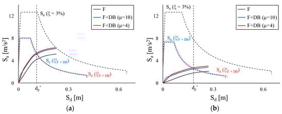 The ductility of the dampers was chosen at the beginning of the retrofit procedure by the designer, considering the characteristics of the devices available on the market. For steel hysteretic dampers, is typically between 4 and 10, providing an equivalent viscous damping ratio between 20 and 40% [,,,]. In this study, two analyses were performed considering the two boundaries of the range, namely and [].