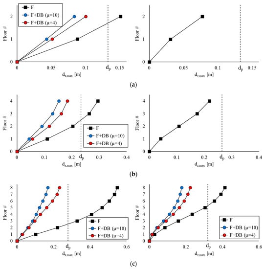 Figure 12 shows the results in terms of the maximum displacement in the X- and Z- directions, indicated as and , respectively. The introduction of the damped braces produced a significant decrease in the lateral displacement, below the design target. It is also worth noting that the upgraded MRFs exhibited similar stiffness in the two main horizontal directions, respecting the relevant requirement provided in EC8 []. On the other hand, the procedure was shown to provide conservative results, as the averaged roof displacement of all retrofitted buildings was smaller than the target displacement : considering the three MRFs, the gap in the X-direction ranged between 17 and 25% with µDB = 4 and between 35 and 45% with µDB = 10, while in the Z-direction (8-story MRF only) the gap was about 30% with µDB = 4 and 40% with µDB = 10.