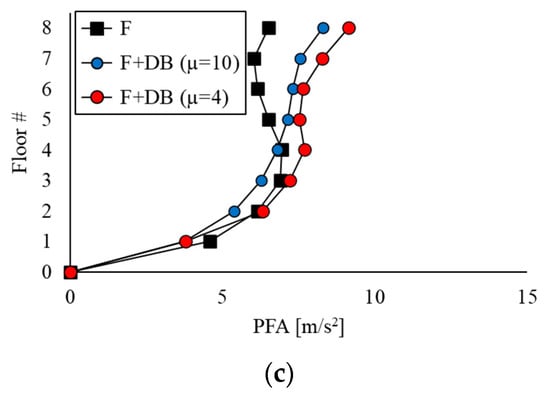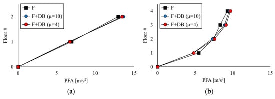 The maximum bidirectional peak floor acceleration (PFA) at each story is plotted in Figure 13. The two-story and four-story frames do not show a significant increase in the PFA moving from the bare to the upgraded configurations. In the eight-story structure, the PFA has a non-negligible increase, especially from the fifth up to the last floor, where the PFA passes from 6.5 m/s2 in the bare configuration to 8.3 m/s2 and 9.1 m/s2 in the retrofitted configurations for µDB = 10 and µDB = 4, respectively.